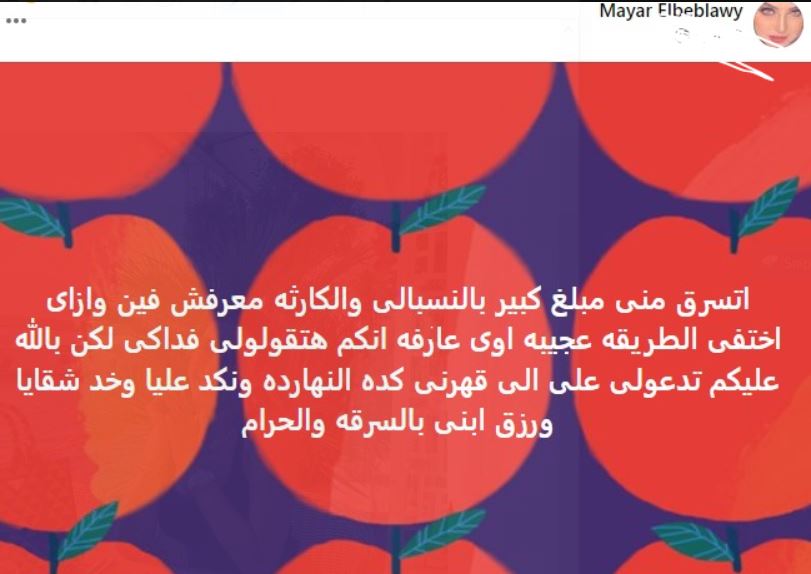 وكتبت: "اتسرق مني مبلغ كبير بالنسبة لي والكارثة معرفش فين وازاي اختفى، الطريقة عجيبة أوي، عارفة انكم هتقولولي فداكي لكن بالله عليكم تدعولي على اللي قهرنى كده النهارده ونكد عليا وخد شقايا ورزق ابني بالسرقة والحرام".