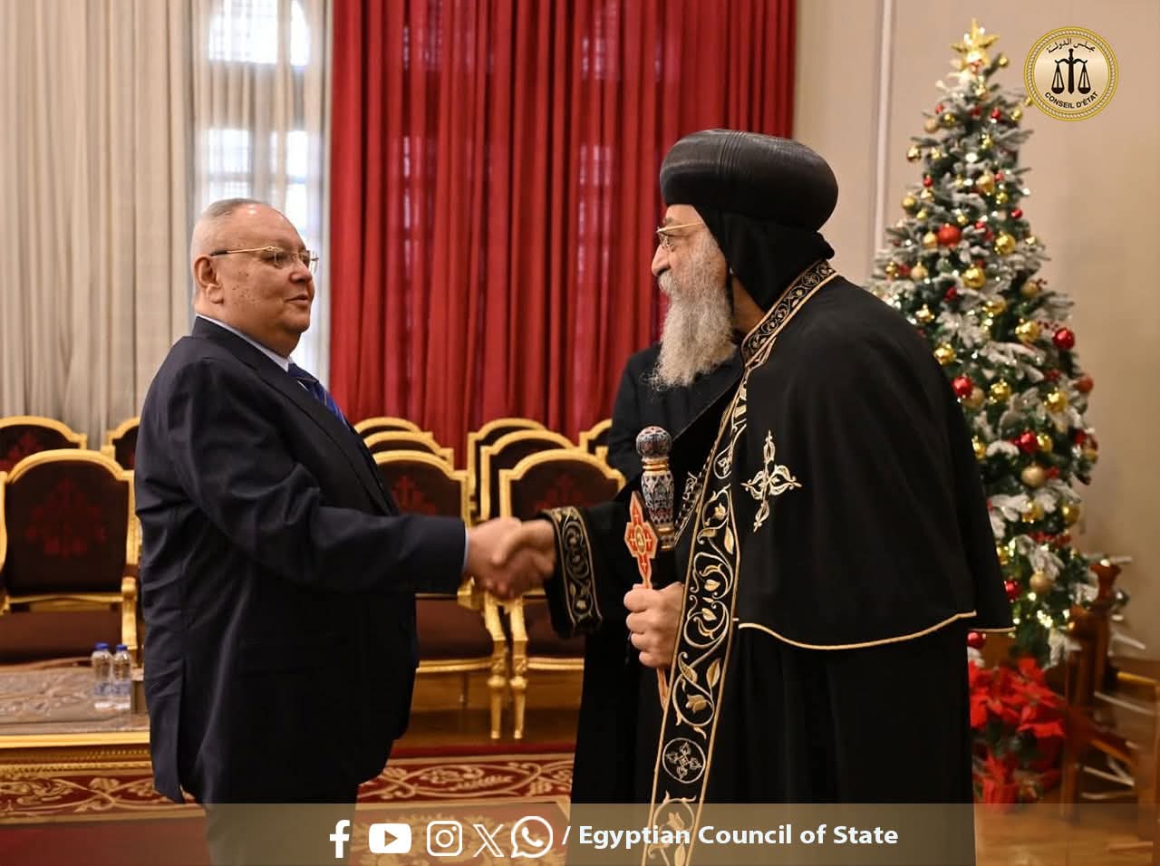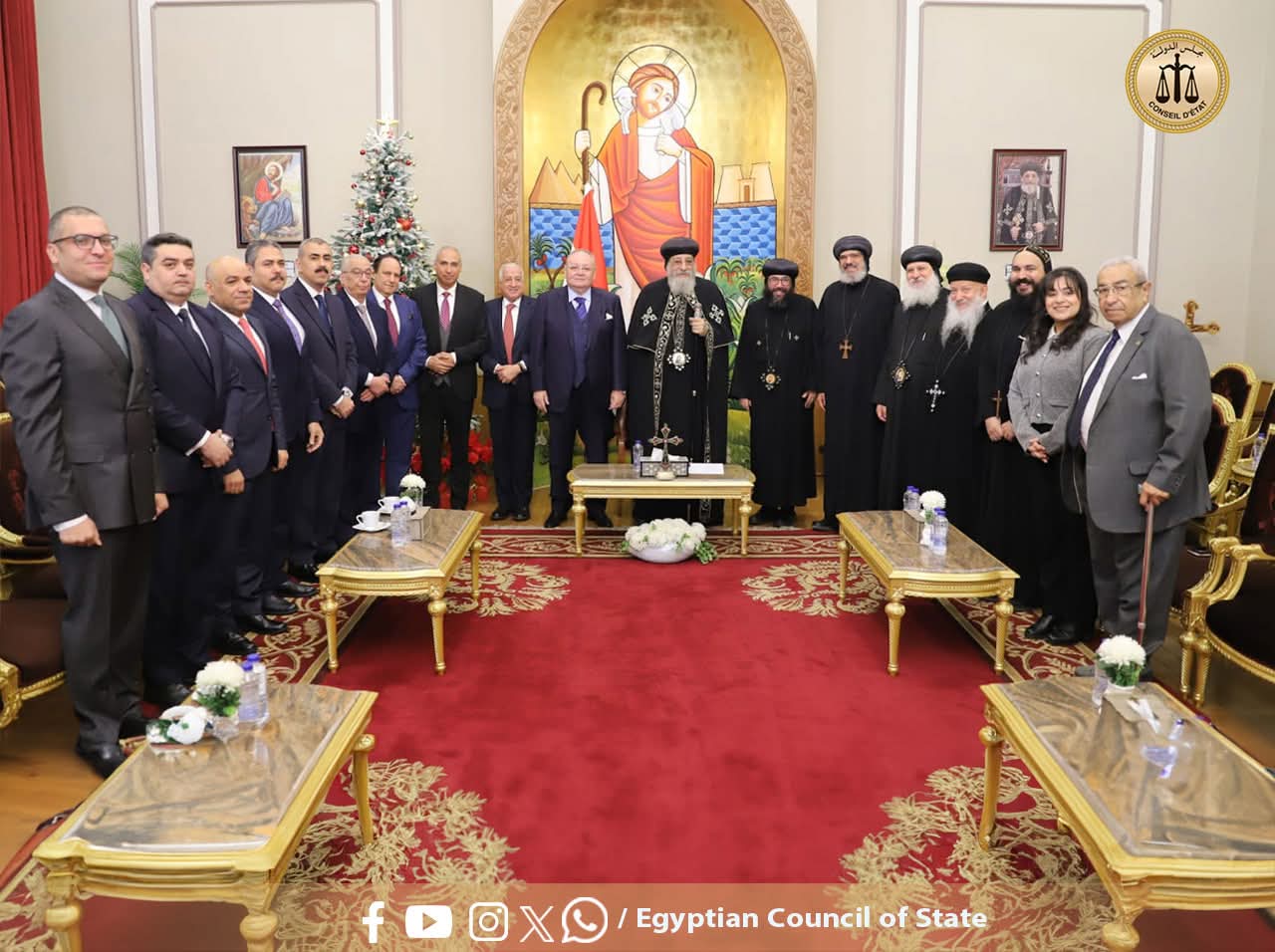 ولفيف من قضاة مجلس الدولة بزيارة قداسة البابا تواضروس الثاني بابا الإسكندرية وبطريرك الكرازة المرقسية، لتهنئة سيادته بمناسبة عيد الميلاد المجيد، وذلك بمقر الكاتدرائية المرقسية بالعباسية.