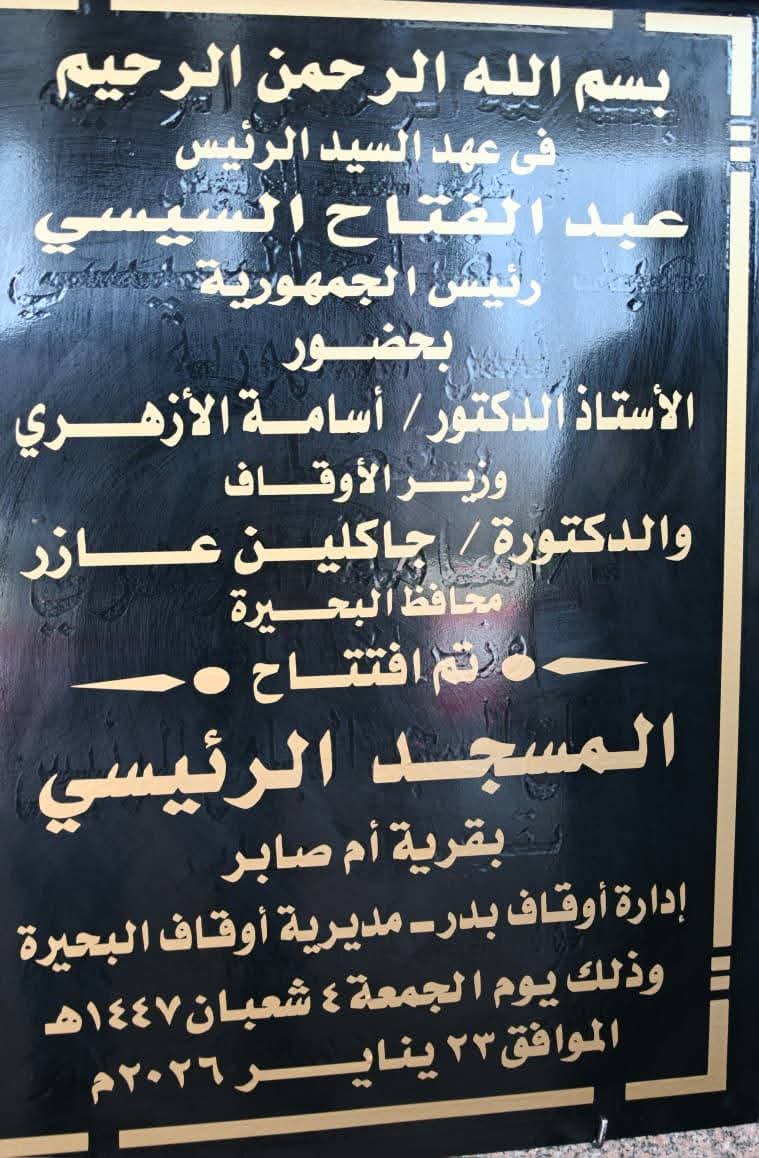 افتتح فضيلة الأستاذ الدكتور/ أسامة الأزهري - وزير الأوقاف، والمستشار/ محمود فوزي - وزير شؤون المجالس النيابية، والدكتورة/ جاكلين عازر - محافظ البحيرة، المسجد الرئيسي بقرية أم صابر بمركز بدر.