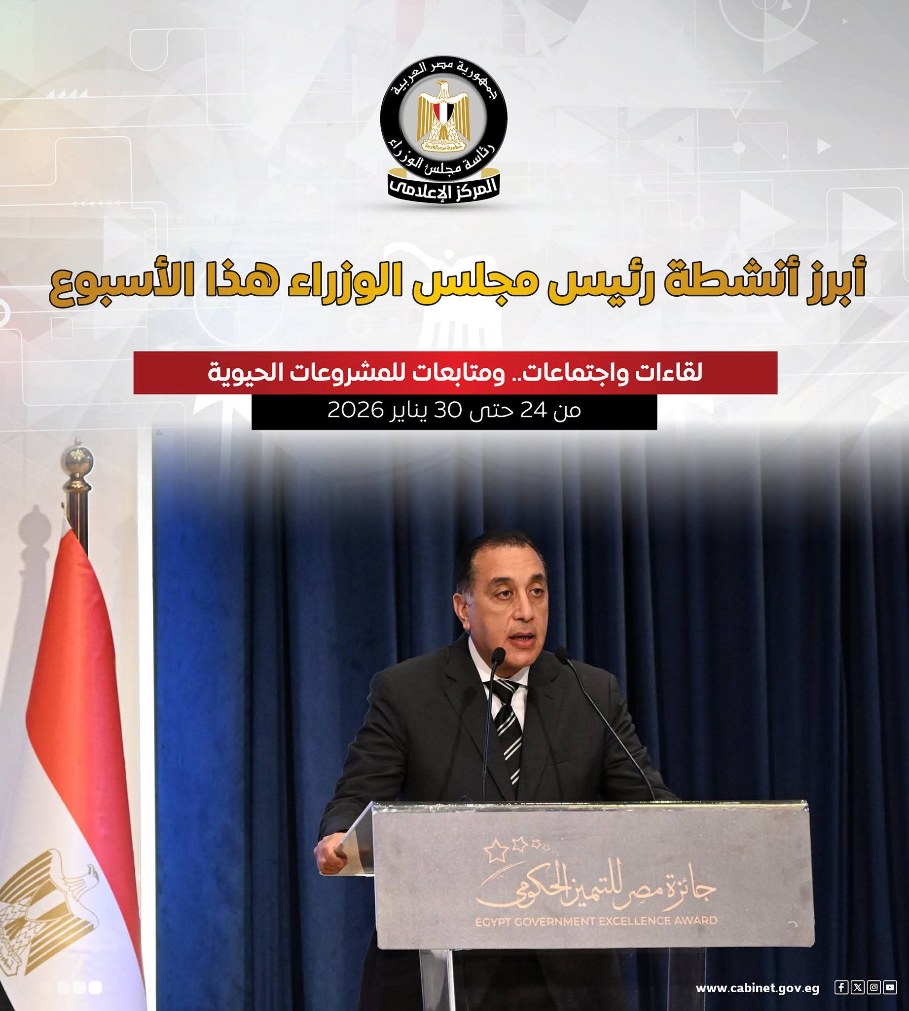المركز الإعلامي لمجلس الوزراء يستعرض بالإنفوجراف أبرز أنشطة رئيس مجلس الوزراء هذا الأسبوع
