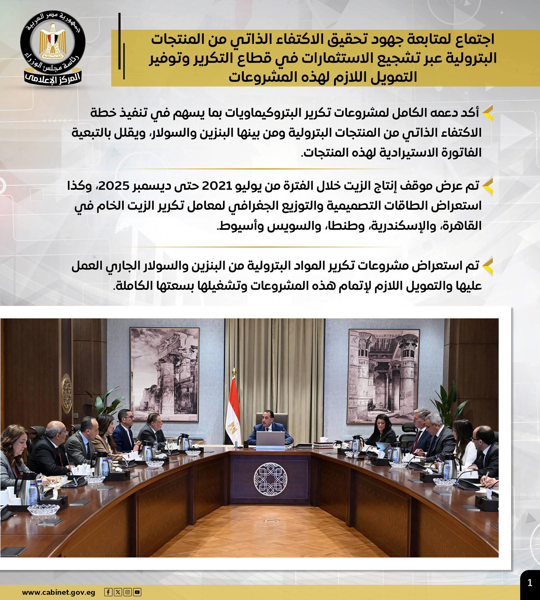 - رئيس الوزراء يؤكد دعمه لمشروعات تكرير البتروكيماويات لتنفيذ خطة الاكتفاء الذاتي من المنتجات البترولية