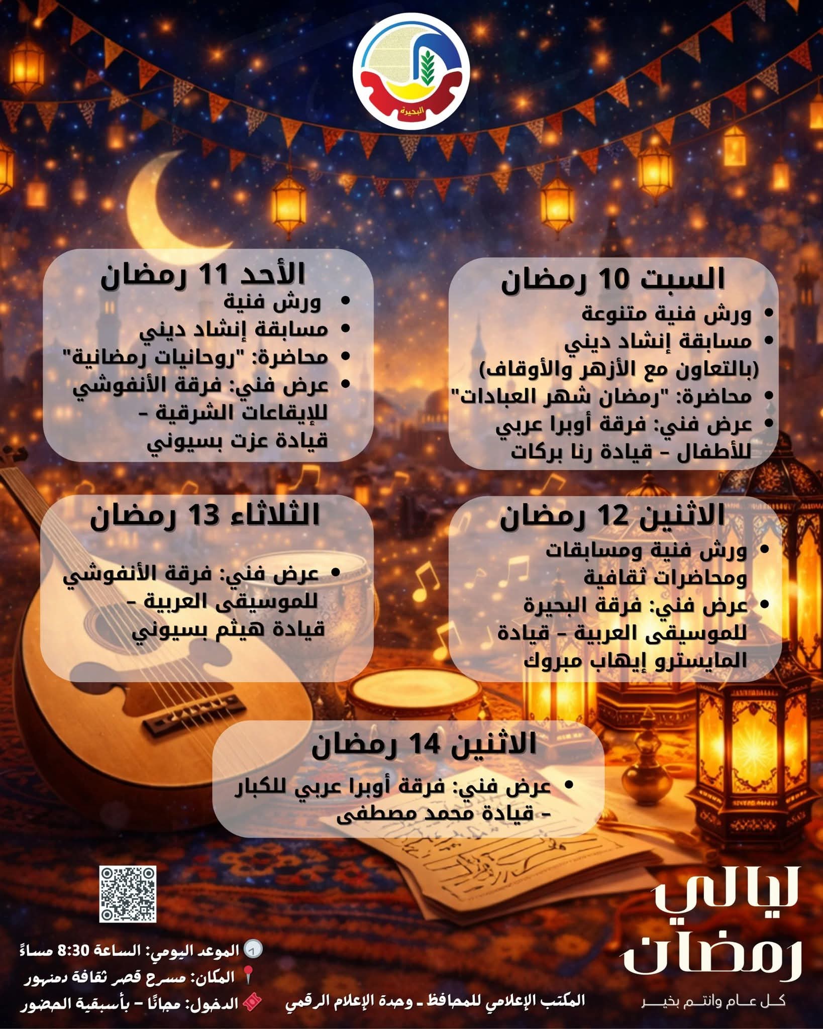 بدءاً من اليوم وحتى ١٤ رمضان .. إنطلاق فعاليات ليالي رمضان الثقافية والفنية لتُضيء مسرح قصر ثقافة دمنهور ببرنامج حافل من العروض والورش الفنية ومسابقات الإنشاد الديني بالمجان